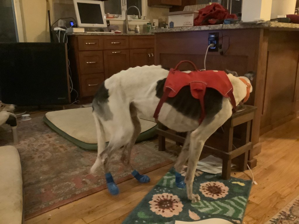 These stop the skating. Feet stay planted. Having just the aft end in socks lets Nick help with the step climb. Having the front feet socked keeps the feet under Nick. The socks appear to reduce energy needed to stand and walk. Stance and gait improve and Nick is much more active.