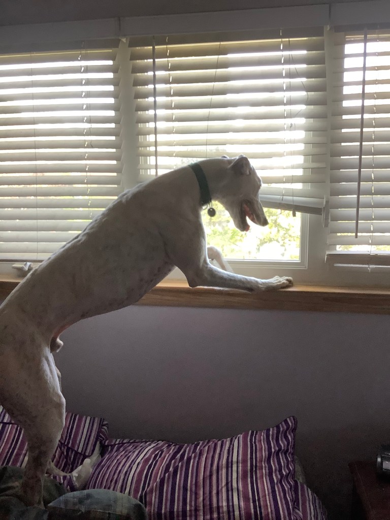 The restless bit comes from my fascination with the blighter behind all the shinny surfaces at eye level. I keep barking at the blighter and asking to go out to run him off. Moocher is going crazy.