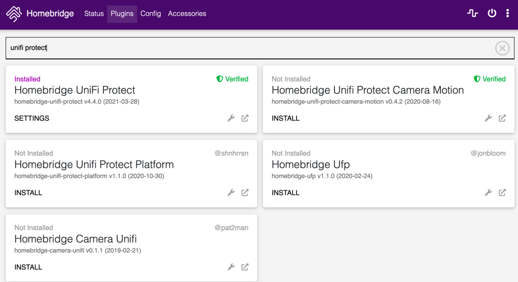 As you can see, I picked the HomeBridge UniFi Protect plugin. It had the capabilities I wanted and it was “Verified” meaning it had received some level of peer review that found it sufficiently polished and complete for general use. I recommend use of verified plugins unless you’re up for some adventure.