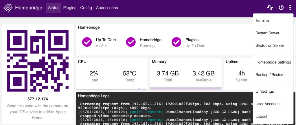 The RaspberryPi 4b snaps into its case. I used BalenaEtcher App to transfer the HomeBridge zip file onto a microSD card. I used a 32 GB SanDisk of the video rated kind. I installed the video card, cabled up to the Study Rack switch (UniFi Switch-8-50), started the Pi, and browsed to homebridge.local. The official procedure is at https://github.com/homebridge/homebridge-raspbian-image/wiki/Getting-Started