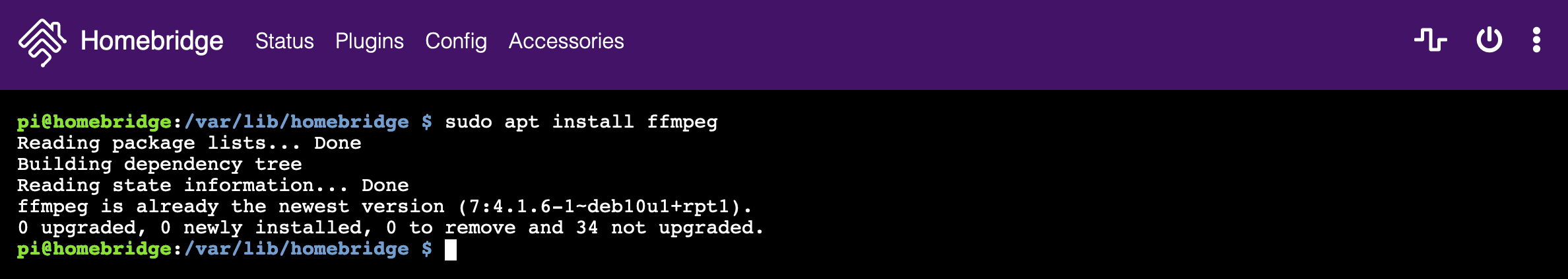The HomeBridge image needs the FFMPEG library added. Do that in the terminal which you can conjure up in the browser as shown below.