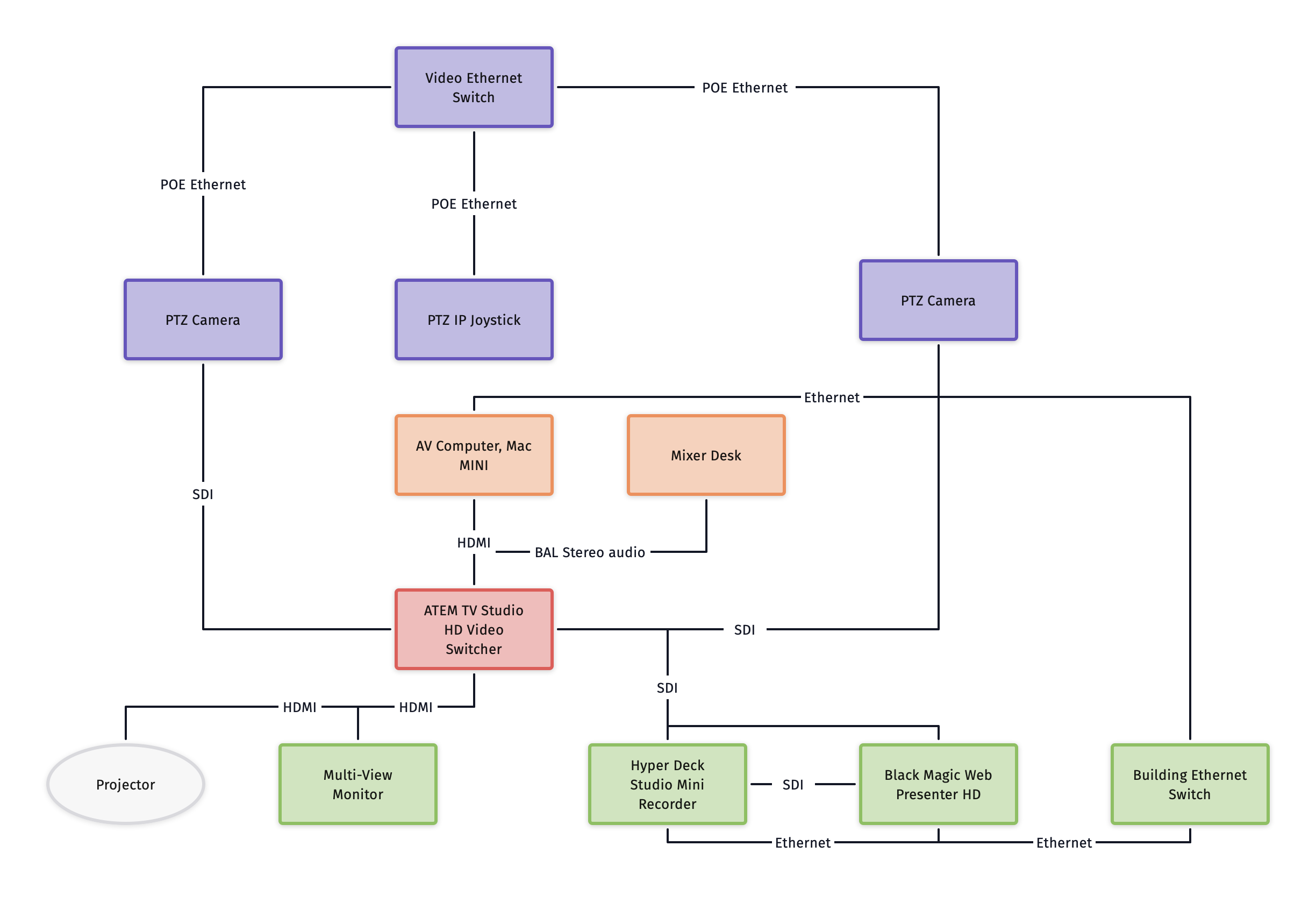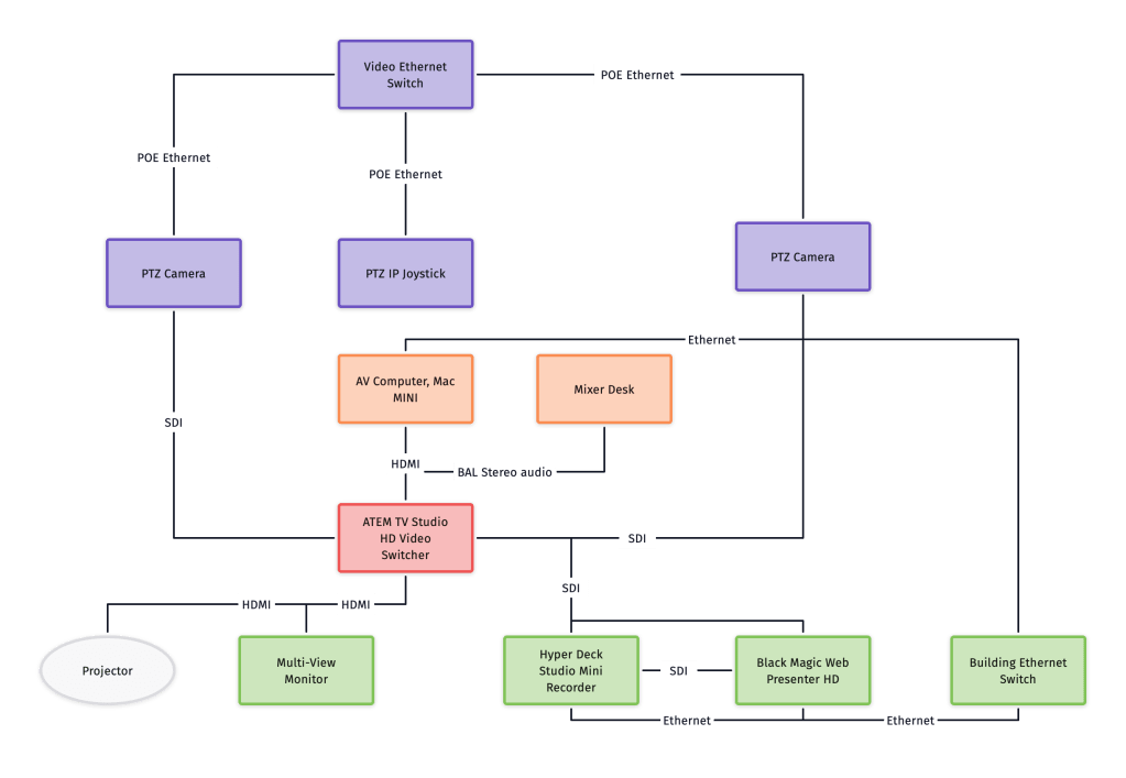 The figure below shows our notional system block diagram with the exception of the multi-media computer. The system design uses Black Magic Design electronics and PTZ Optics cameras to provide the live video. A Black Magic Design ATEM Television Studio HD swithcher selects camera video and multimedia video and keys in overlay and background material. A Black Magic Design dedicated recorder and streamer handle the necessary format conversions, recording, and streaming. This gets these continuous flow tasks out of general purpose computing hardware.