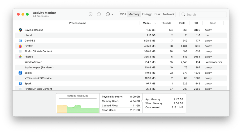 Perhaps the easiest thing is to begin your typical work flow, open Activity Monitor, select the memory tab, sort by Memory decreasing, and look at the totals below and the memory intensive processes. Here ClamAV for MacOS is the top dog with over 1 GB allocated. So, for day to day use, 8 GB is fine. If you expect to be working with a DAW or a video editor, select 16 GB.