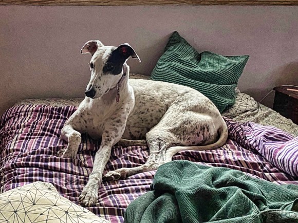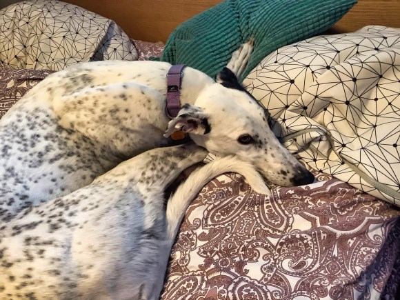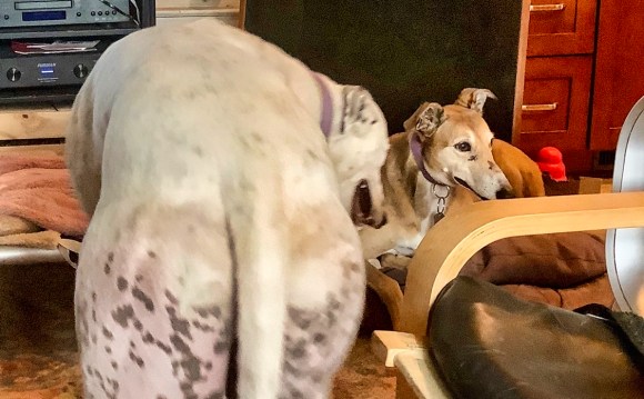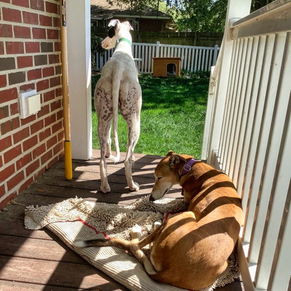 I’m also becoming chill toward the neighbors. I don’t chase bikes, strollers, and skaters quite so aggressively. But I still give them a piece of my mind. Yes, I’m reactive for a greyhound and His Dismal Majesty hypothesizes that I was fitted with a terrier brain by mistake.