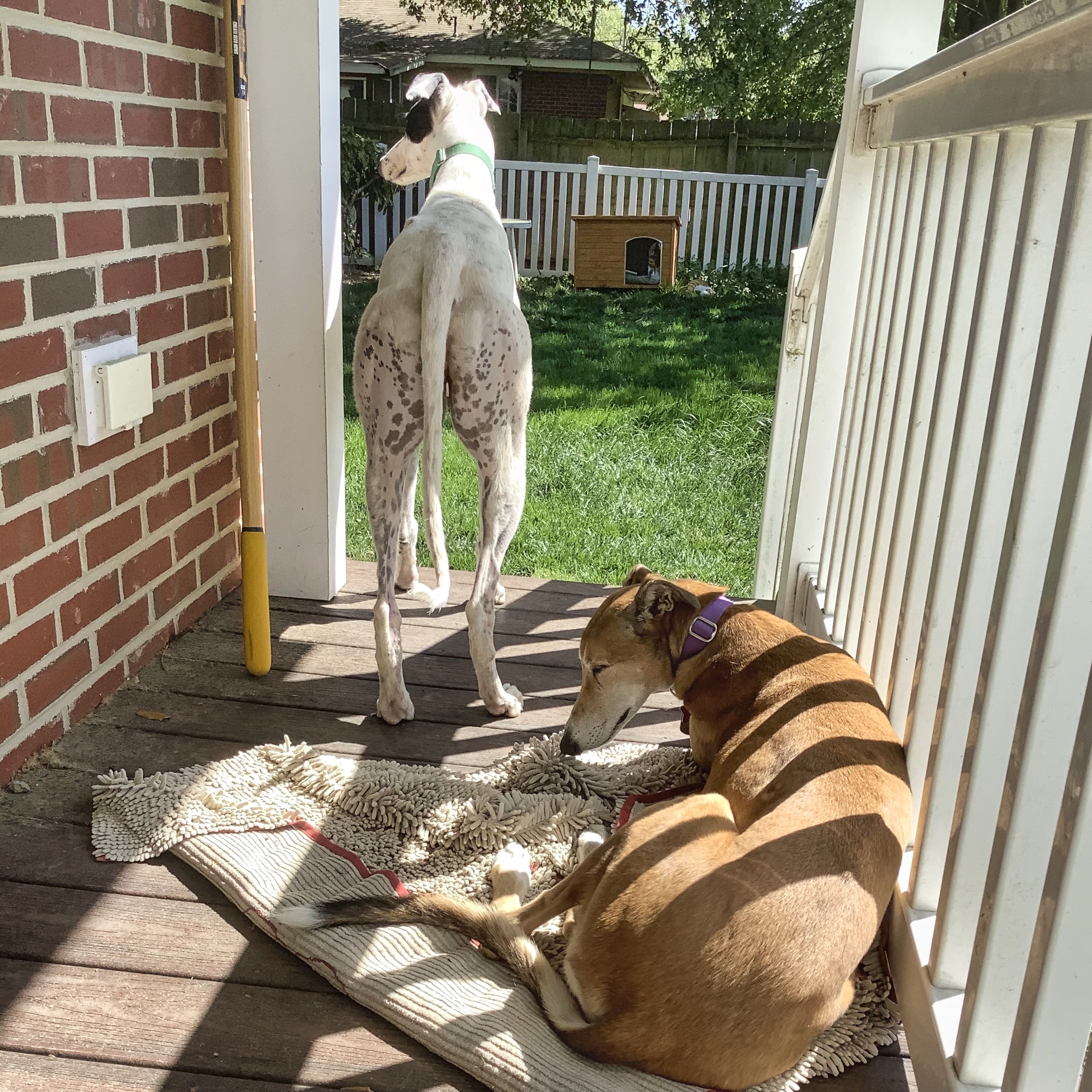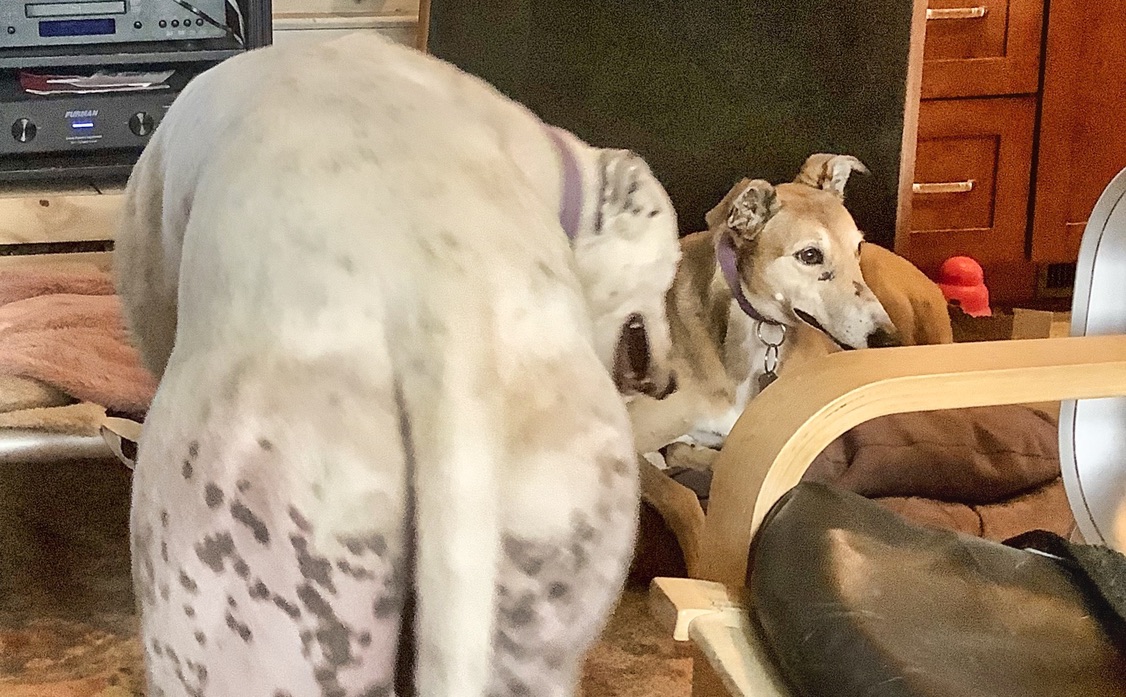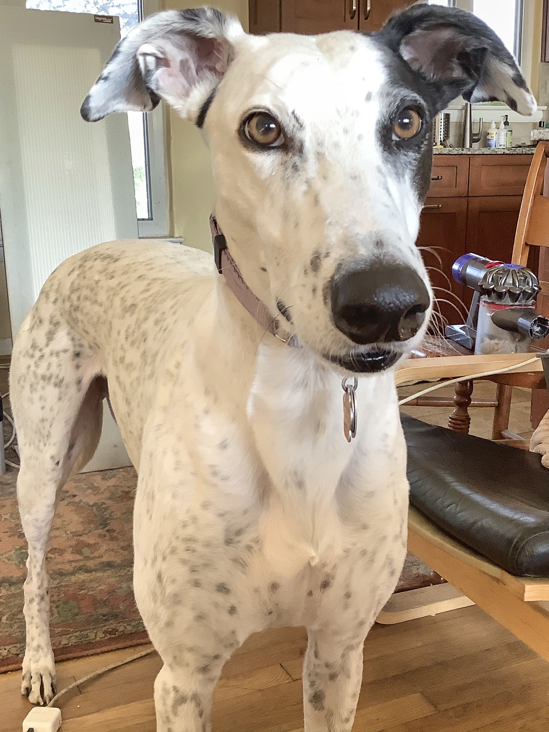 As you know, I’m a March 2020 COVID-19 refugee from Florida. When racing first stopped, my owner decided I should retire and offered me to James River Greyhounds for adoption. So anyway, I boarded the JRG hauler hoping for a placement. They schlepped me to the Richmond area and matched me up with Dismal Wizard, gave me a bath, and sent me off with 3 months heart worm and hookworm medications.