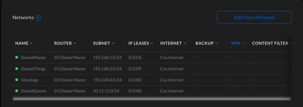 Each of the 4 networks, Dismal Manor, Dismal Things, Dismal Guests, and Greydogs must be mapped to one of the established IPv6 local address delegation ranges. Today, Ubiquity UniFi SDN lets us do this on the Networks page as shown below.