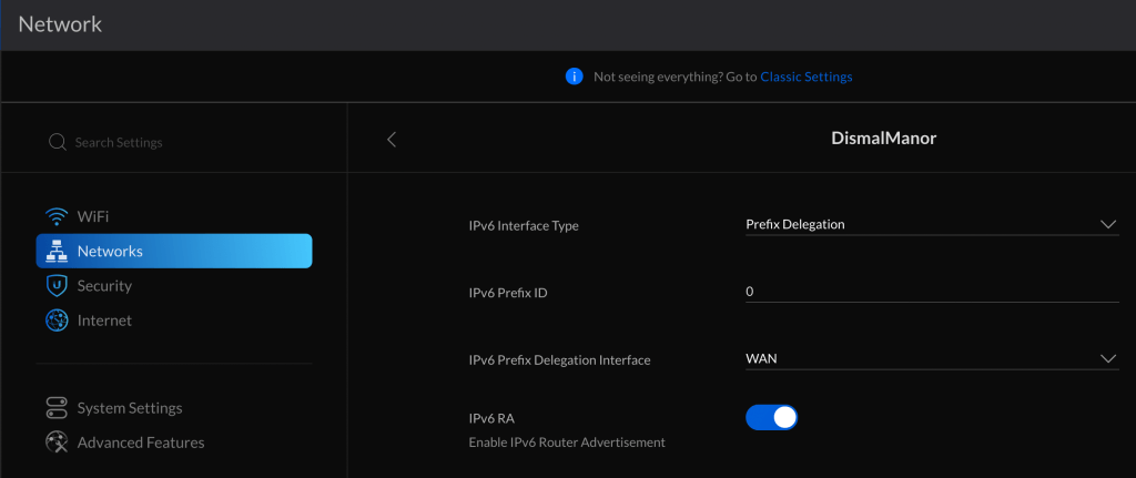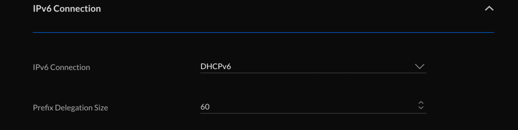 Most home installations will not need to partition the local IPv6 network. I have elected to do so here to keep my things and my guests away from the family network, particularly my backup servers, media, and photos. I do this using the IPv6 “prefix delegation” capability. This, as we shall see, is a brilliant example of bad naming. But Ubiquity has to be able to match stuff up with the RFC’s and IP datagram fields.