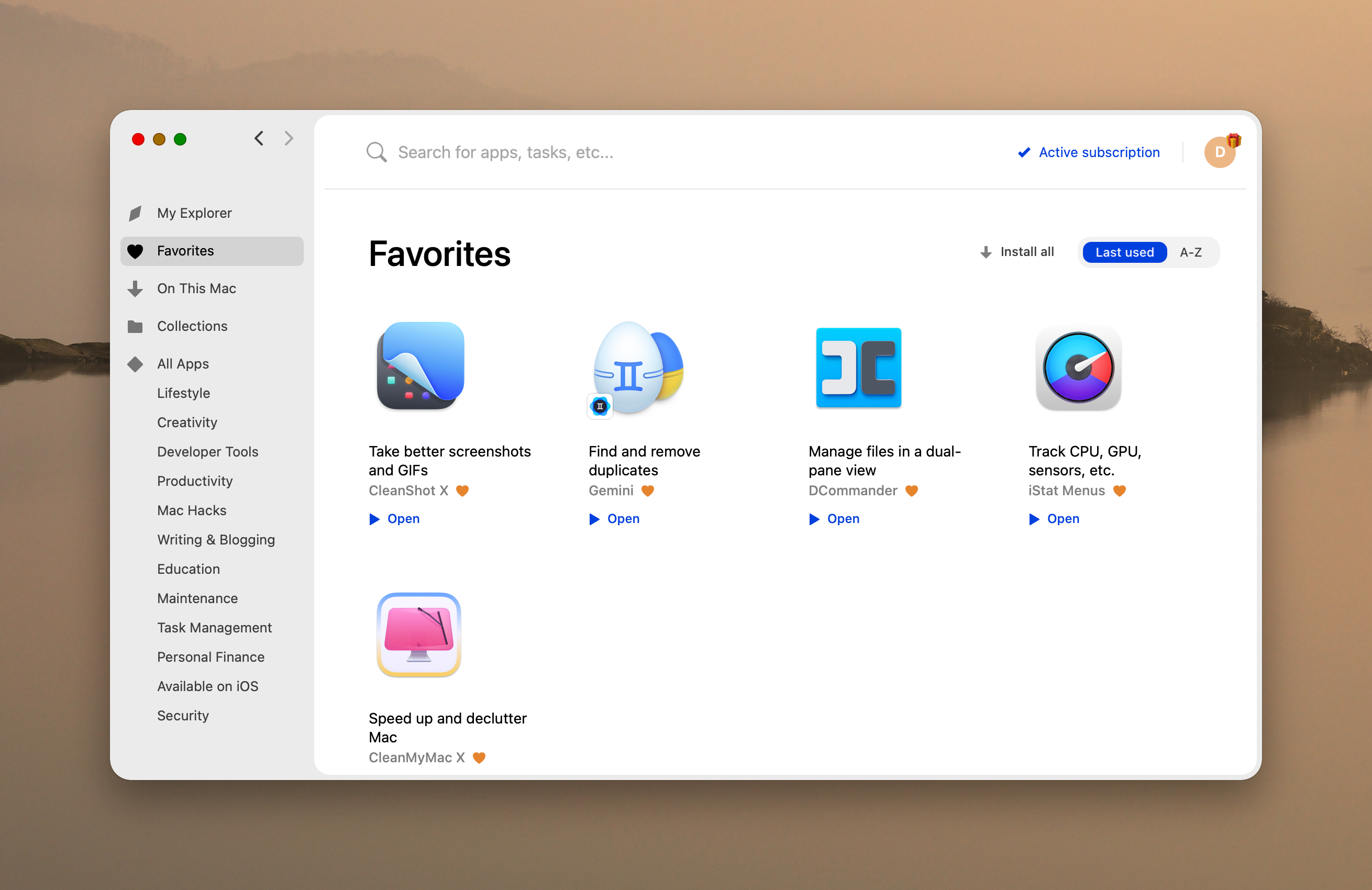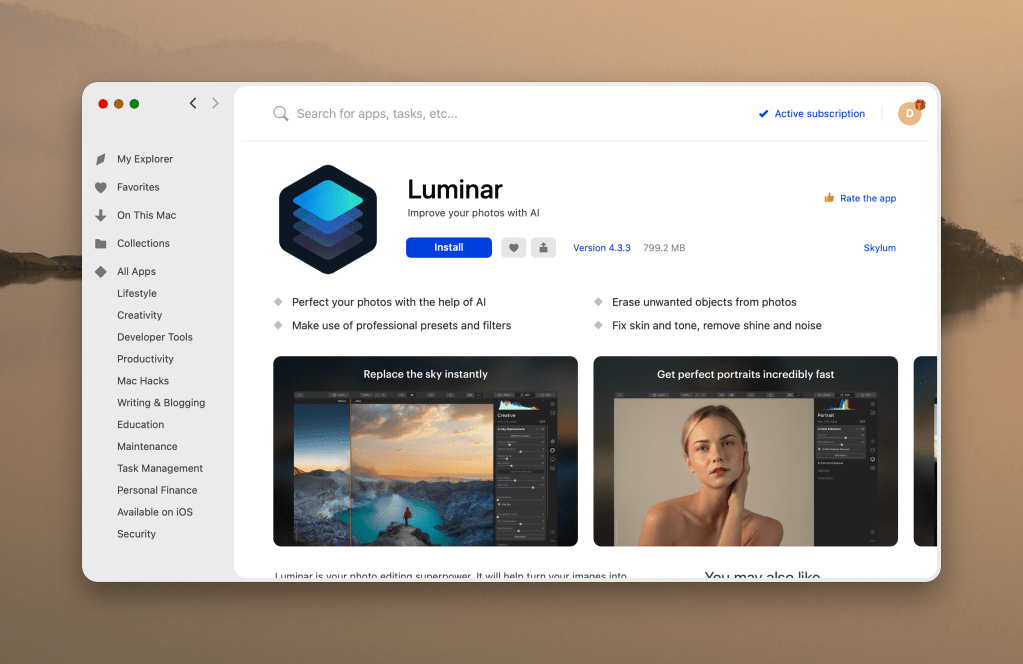SetApp is a McPaw product that allows use of a number of products for a monthly subscription of about $10. A number of these are popular products that are used as tasks arise. Luminar AI but not Neo is available in SetApp. SetApp is a good way to obtain access to tools you use every now and again as with Clean My Mac and Gemini. It is also a good way to try apps like Luminar. Because I use Luminar daily, I subscribe directly from Skylum