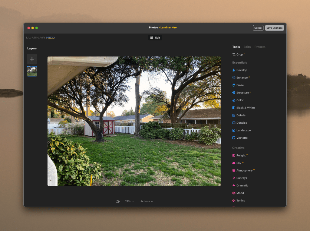 Luminar Neo calls the individual editing functions tools. The Neo tools are a refinement and expansion of the AI tools. Tools are now organized into 3 groups, essentials, creative tools, and portrait tools. The Crop tool and Develop tools are pretty traditional. They operate on the image composition and pixel processing to establish the base appearance of the image. The remaining tools refine the image in some way, often abstract, that alters the look of the image. The color balance and saturation can be manipulated in a manner similar to that in photos or in a subject matter oriented manner. For example, the Landscape tools relight the image with golden-hour light and enhance foliage greens without affecting, say, the color of green siding on a house.