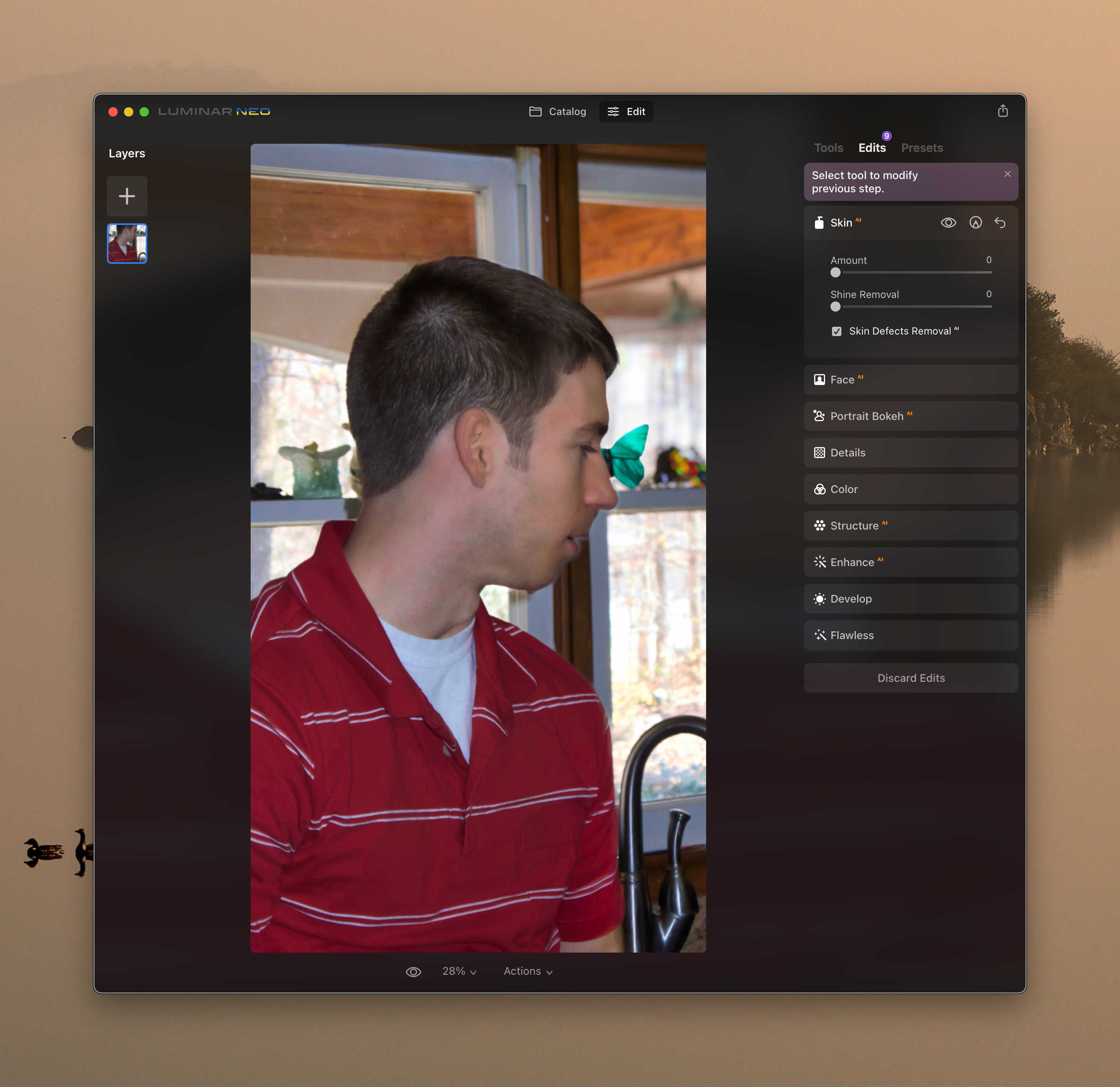 In editing this ancient image of Andrew, I made the edits shown in the stack below. Luminar Neo preserves these edits in the catalog.