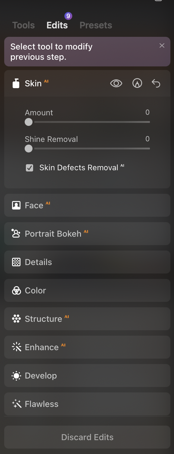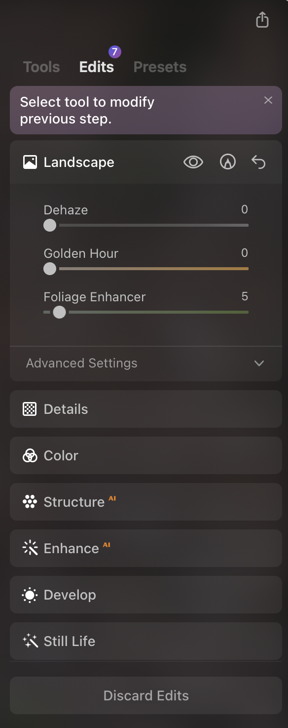 The Luminar products are largely effects oriented. The Crop and Develop tools behave very much like traditional photo editors. The remaining tools make changes across the image to alter its look in an abstract way suggested (but not always) by the tool’s name. This is generally OK as each transformation is saved on the edits stack, transformations are orthogonal in their settings, and individual transformations can be undone.
