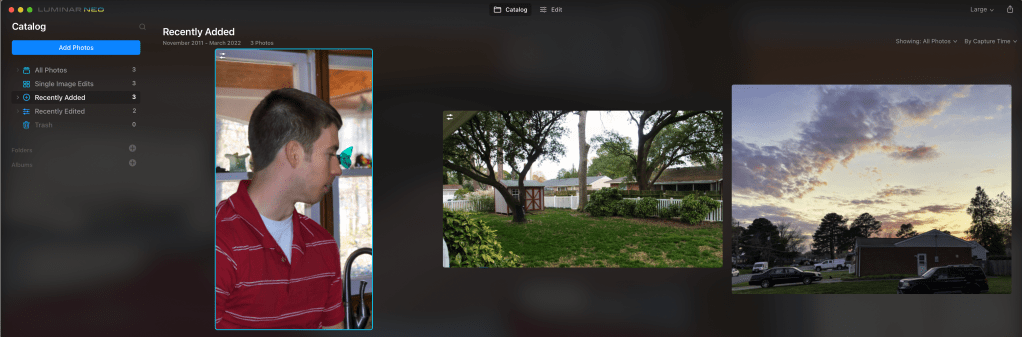 Luminar has a basic asset manager and ability to import images from camera media built in. But asset management is not a primary project objective. Other smart people at Skylum are developing an asset manager that is expected to solve all the worlds asset management problems. It will probably be client and project oriented but they may surprise us with a time oriented product like Photos.