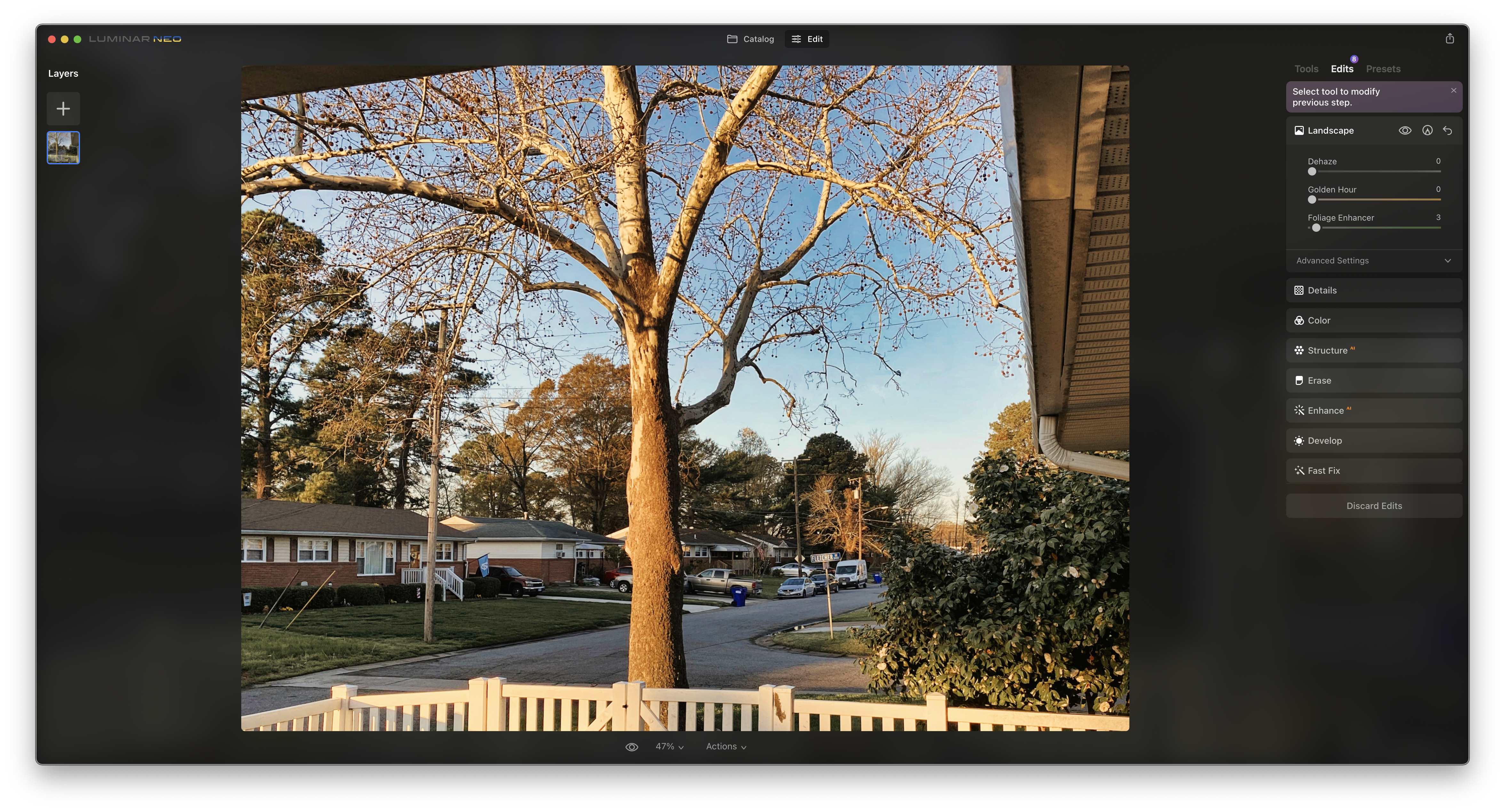 Luminar Neo maintains an edit stack. All tools with the exception of the exception of the crop tool make an entry on the edit stack. Most tools operate on a masked area. Usually, masking selects the area to be edited but masking can also be used to bypass an area. Select the area, adjust the tool’s strength settings, then close the tool frame. At this point, the edit is saved on the stack and rendered.