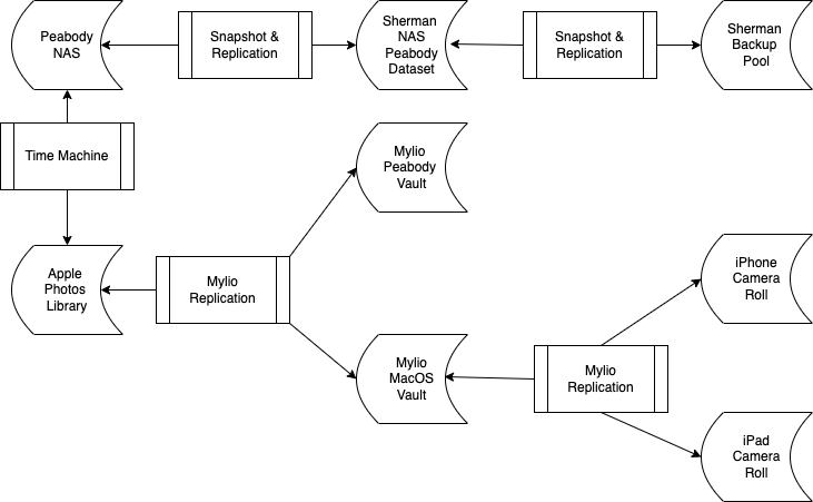 Mylio replicates iPad and iPhone images to the Mylio master vault on Fruit Machine and to the Mylio backup vault on Peabody. Time Machine replicates the Photos library to Peabody’s Time Machine spool volume. Peabody snapshot and replication saves the vaults to the Peabody dataset on Sherman. Sherman snapshot and replication saves the Sherman datasets to the Sherman backup pool.