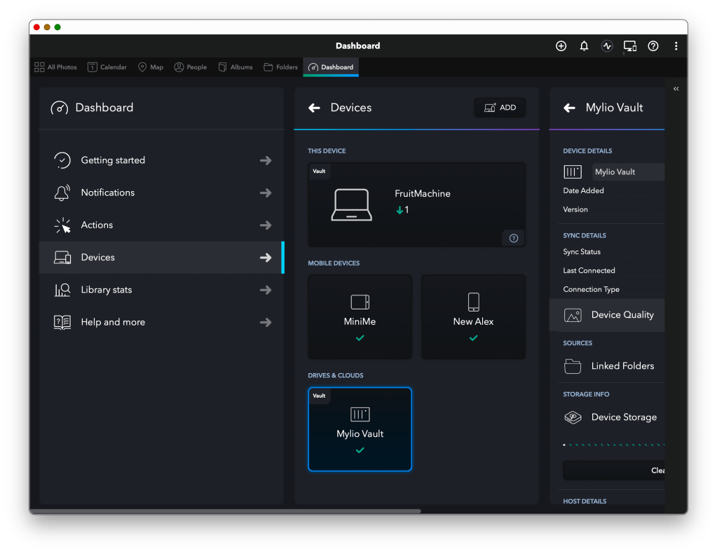 Mylio regards a device as a vault if it is backed up regularly and holds original quality images. In my installation, the iMac known as FruitMachine and a NAS share are vaults. The NAS replicates to a second NAS that backs it up. The backup NAS backs up internally to a large internal disk. Backblaze Personal backs up the iMac off site.