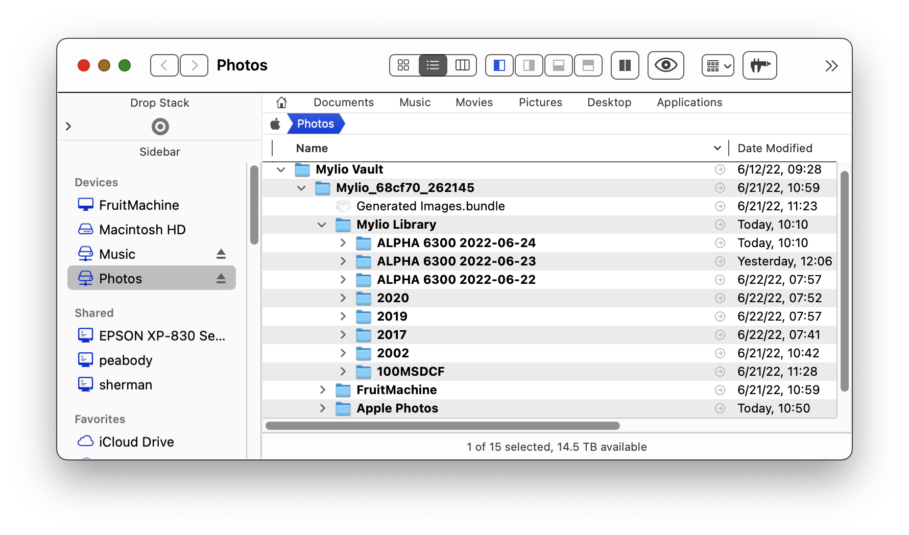 - The four year-numbered directories that follow are my four Apple Photos libraries. Mylio found these on its own when it searched the system disk for photo assets.