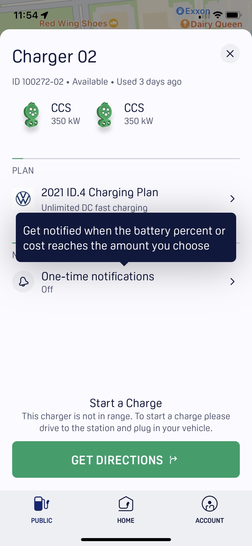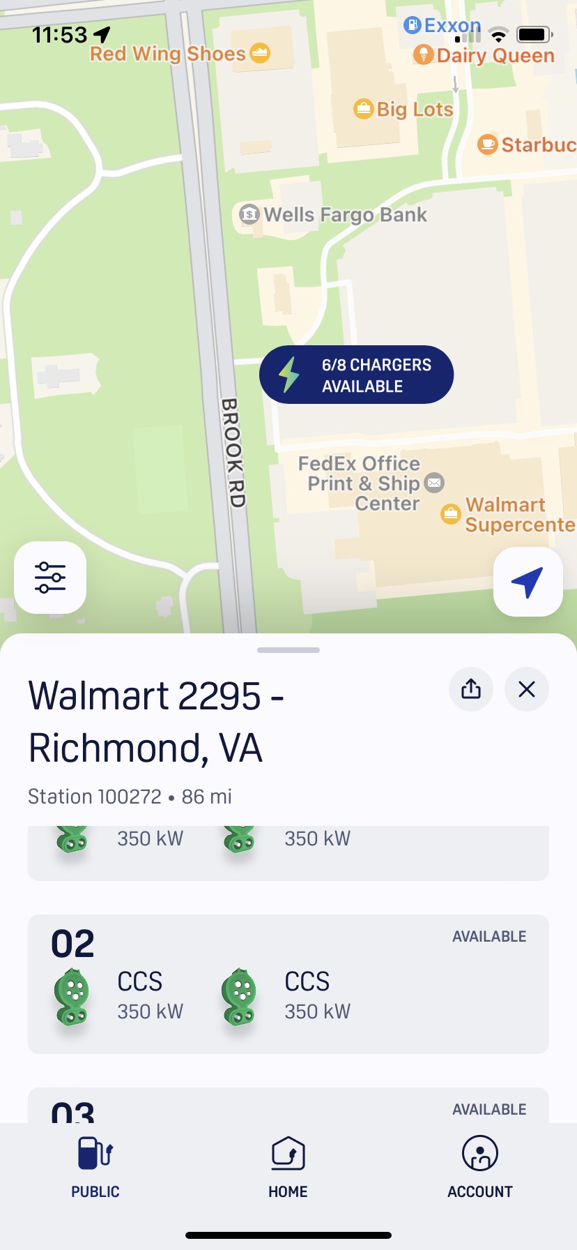 At the start of the leg to the charger, open the EA App and enter your charging site (for example Walmart 2295) in the search box. The EA App will locate the site and pan the map there. A list of nearby EA locations appears below the map. The specified site should be at the top as shown below. Select the charging site by tapping its entry in the list of nearby charging sites. Tapping the list entry is easier than messing with the map. Tap the pin to open the charger availability bubble. That will select the charger in the App. The text box will change to show the Directions button.