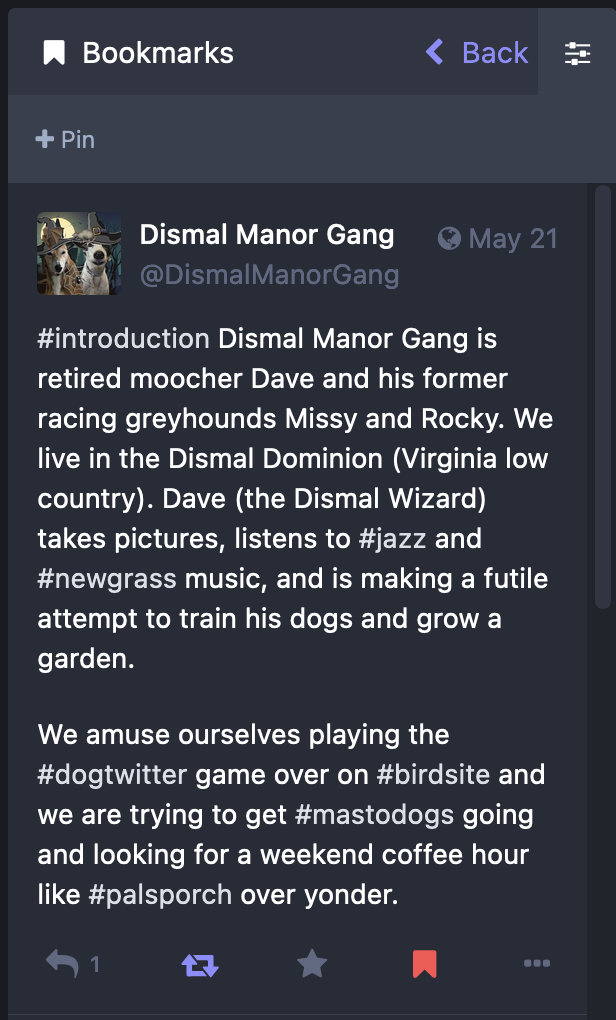 When you see a nice photo or read an interesting post, favorite it. Favoriting tells the author that you like what he wrote. Mastodon delivers favorites as notifications. When we receive a notification, we review the originator’s profile to see if this is someone we’d like to follow.