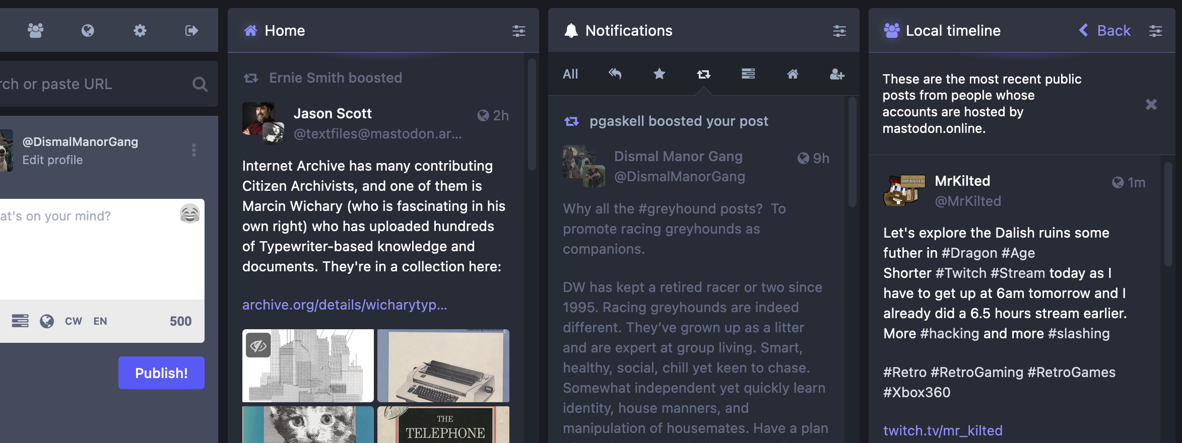 - The center right column shows the notifications including new followers, favorites awarded, boosts awarded, etc.