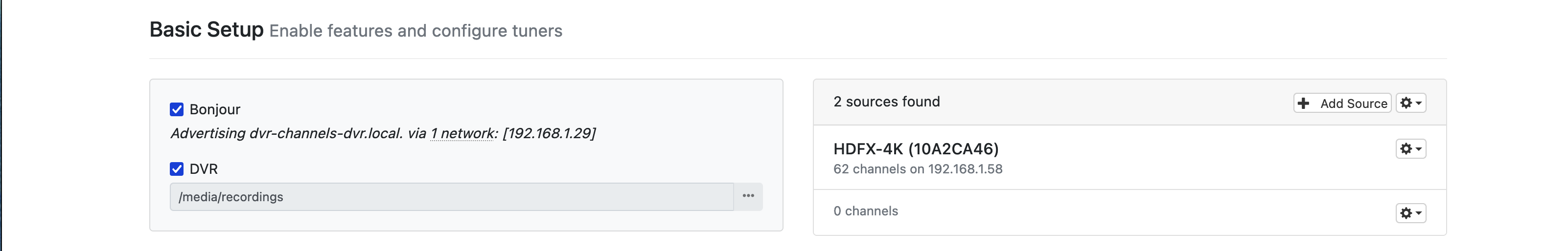 Once installed and running happily, there is installation to do. The installation procedure ends with some output to be saved that identifies the Channels DVR address, host name (here, dvr-channels-dvr.local, and the console port 8089). Note that the address and port will be installation specific. But Channels DVR follows Bonjour zeroconf conventions and the installer will tell you the host name chosen. But once running, you can open the web management interface in a browser tab.