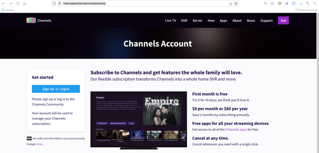 So visit the link [5], create an account and commence a subscription. The first month is free. This lets you get going and decide if Channels is a keeper. After several months, I usually convert from monthly to yearly to save a couple of months of subscription cost.