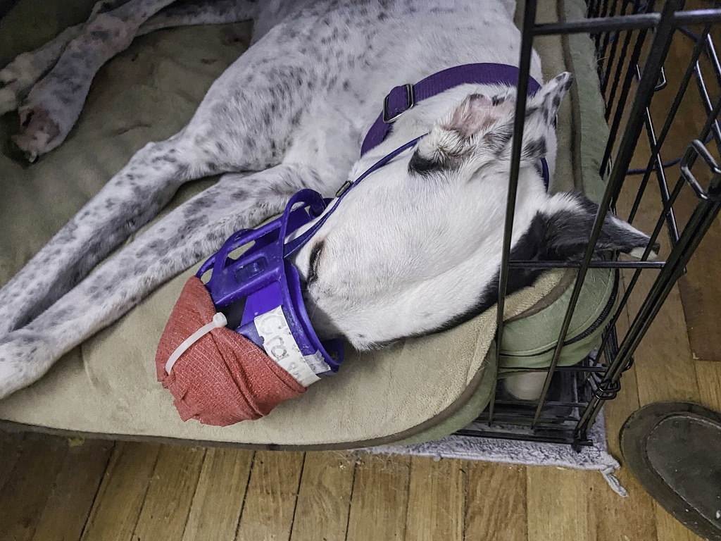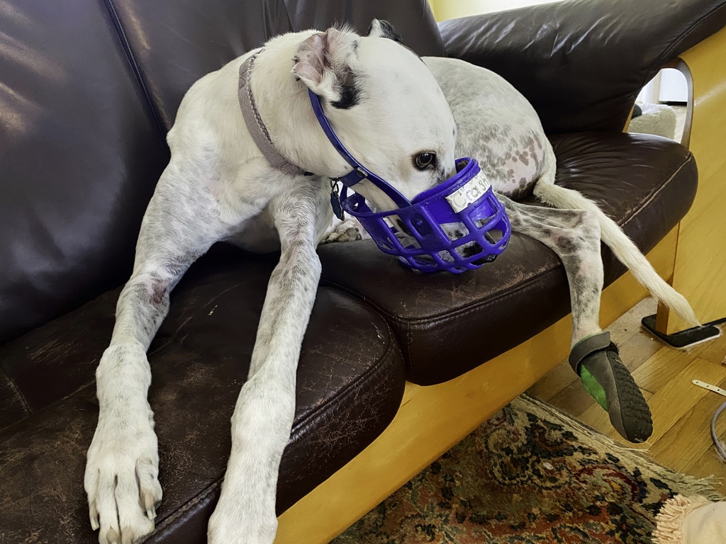 Then I remembered kennel muzzles could be fitted with a stool guard. But I didn’t have one. Could I fake it? Of course. We’ve got VetWrap. This worked but the VetWrap would slip off. So I added a couple of zip ties. This was adequate but not optimal. So off to the shops.