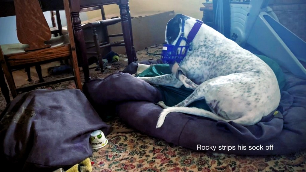 Rocky quickly learned to operate the velcro loop and remove the RuffWear boot. With the muzzle fitted. Rocky was not keen on shoes, at least now with his foot hurting like hell.