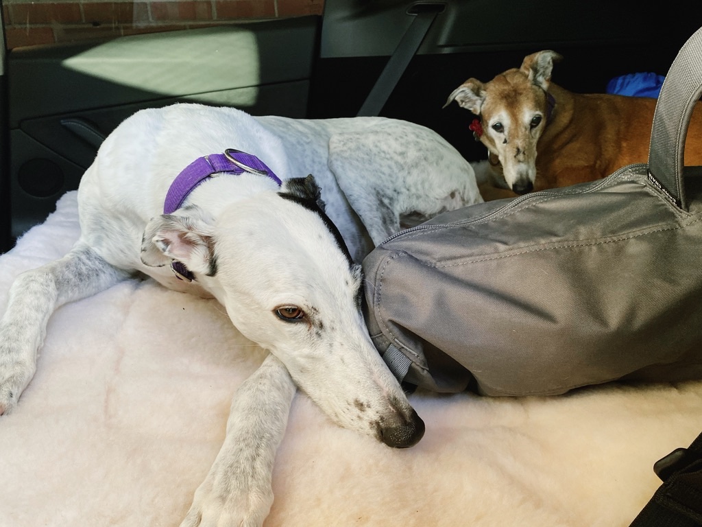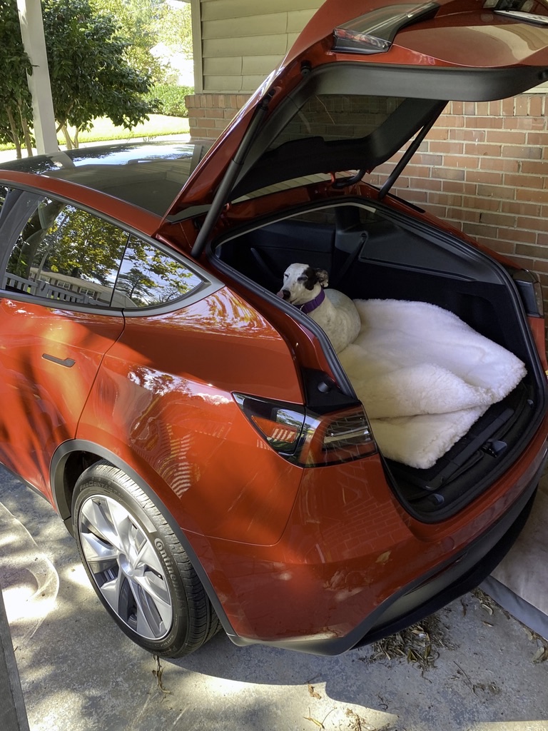 The Model Y has been a joy to drive. It has done nothing weird. It has had no 12 V battery spells. It has not had any issues of any sort. Like the ID.4, the greyhounds can walk into the 2nd row seating. And the boot (wayback) is large enough to carry Missy. The back seats flip down giving a large load floor on which they prefer to ride. Tesla included tie down points on the back of the rear seats to which a dog harness may be secured, something not in the ID.4.