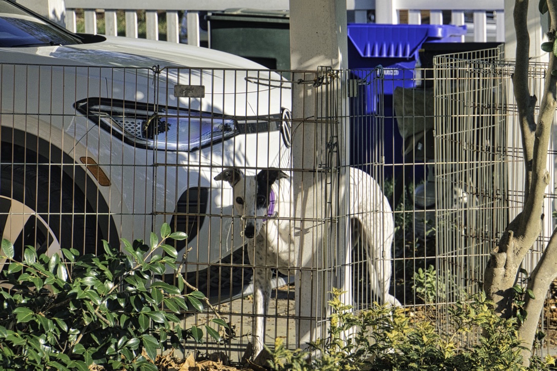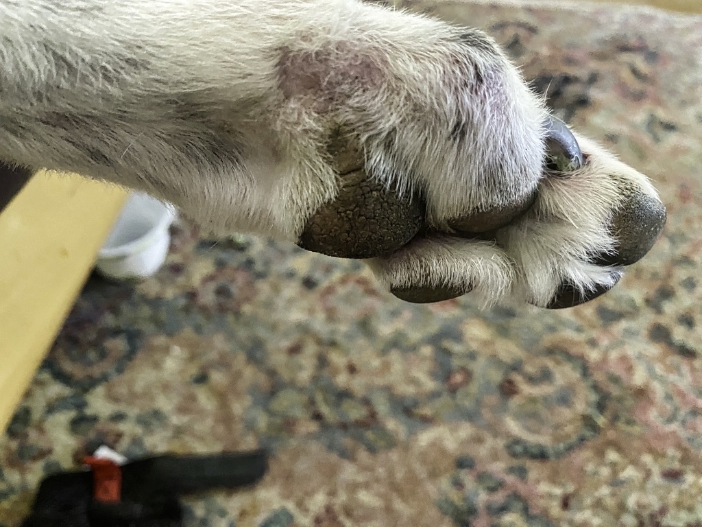 Back in April, Rocky caught a toe in the hardware of the Martingale collar that he was wearing. The toe rotated catching in the loop hardware. Rocky panicked, and gave a yank then another, breaking the toe. After consulting with Rocky’s local vet, James River Greyhounds, and Greyhound Health Initiative we decided to amputate the damaged toe. Everything has healed up nicely. Rocky has no disability from the loss of the toe, a rear outer toe. He does look a bit odd with 11 toes however.