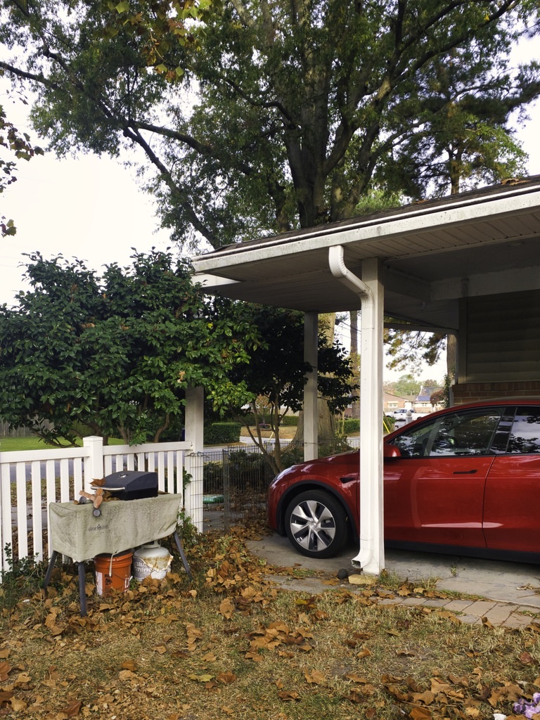 The Tesla is normally in “Space Dock”, our carport guarded by two camellias that are about to bloom. We are about 4 to 6 weeks from “yellow snow” season when the pollen begins coming down thick as the trees flower in turn. I discovered that I could do a “hoseless wash” of Redfin using a soap formulated not to need flushed off the vehicle.
