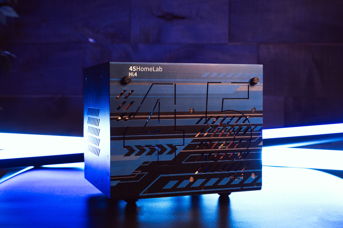 As home lab servers go, the 45HomeLab products are physically robust and easy to live with. The HL4 system is available as a formed, assembled, and painted shell plus drive bay backplane. Front panel options are steel and acrylic. And they’ll paint user supplied graphics as an option.