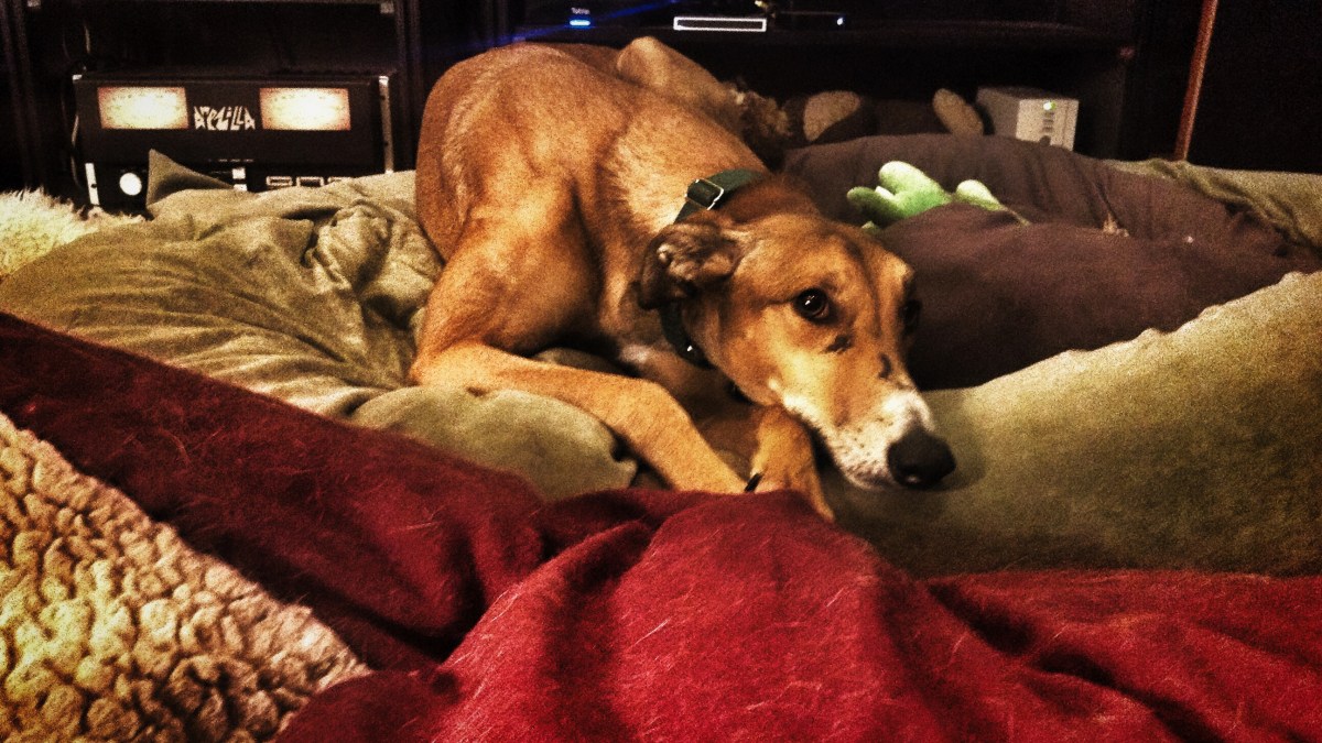 Rocky’s disease progression has featured increasing frequency of throat clearing, occasional coughing, and most recently, a change in eating habits from hovering all available food to picky eating and eating after me. He seems comfortable and is still engaged in greyhound things. Rabbit and squirrel chasing is down but he’s still a fence troll, especially of dogs and motor bikes. Strollers and bikes not so much now.