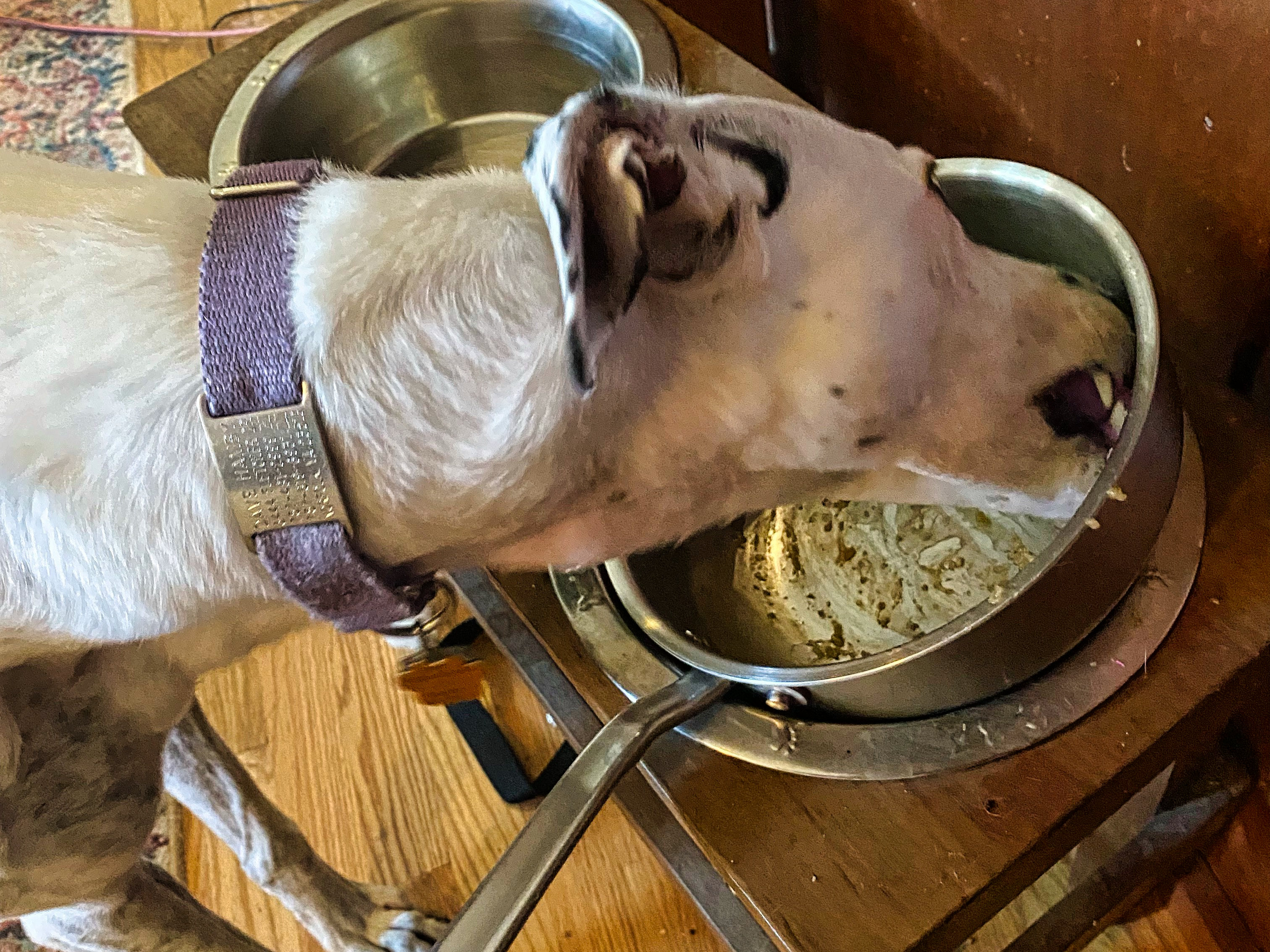 Care of the Racing and Retired Greyhound gives feeding guidance for greyhounds while they are racing. Most eat ground meat, pasta or rice, greens or diced tomatoes, and maybe some good quality commercial kibble. So I decided to give Rao’s Bolognese sauce a try as it was similar to things in his diet while he was “in the show” racing at Orange in Florida. And he started eating. Stool improved. And he’s more active. And weight is down to a proper pet weight — hip points and 3 ribs visible.