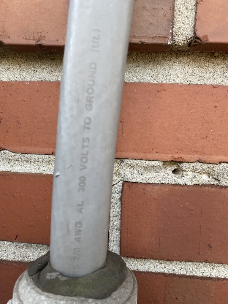 The bottom corner of the soldier course appears under the UL label on the mast feeder cable.