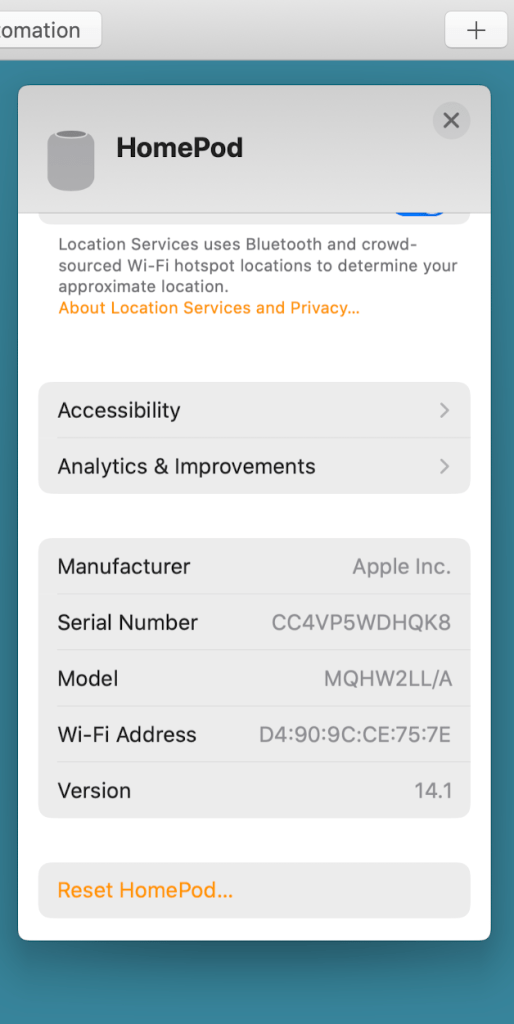MacOS Home App lets you check the HomePodOS version fairly easily. Double click on the tile representing the offensive HomePod. It will open to show the device’s preferences pane. Scroll to the bottom where the device ID and software version information appears.