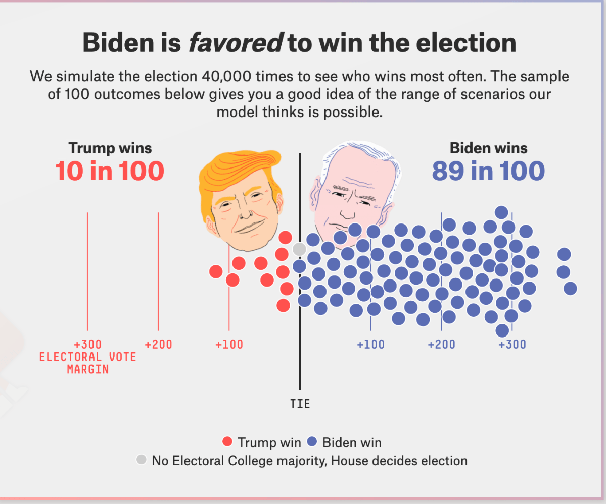 Thanks to Five Thirty Eight and NPR for the use of the figures illustrating this post. And also thanks to Nate Silver for his innovative work in political election modeling. This article explains how to interpret the Five Thirty Eight election products. Thinking about probabilistic and statistical models is tricky stuff. What Nate is doing is essentially political weather forecasting.
