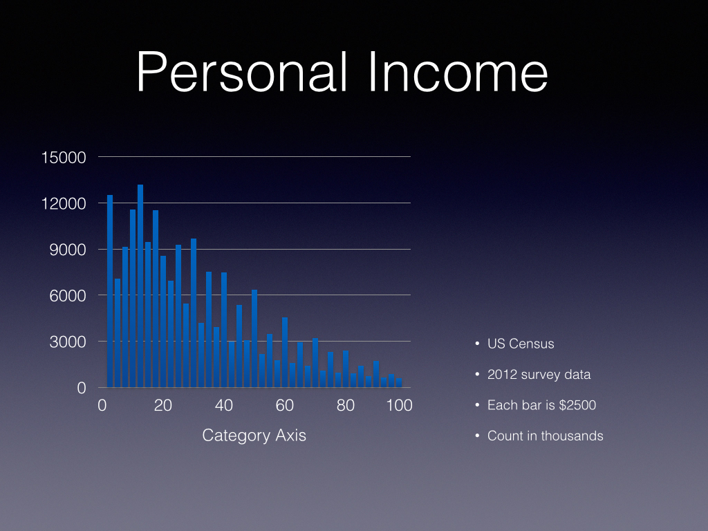 This figure shows the Census Bureau’s 2012 estimate of individual income density in the US. The bar height is proportional to the number of individuals in a $2500 band, for example from $40,000 to $42,999. Normalizing by the total number of people surveyed gives an estimate of the probability density function of income levels in the US.