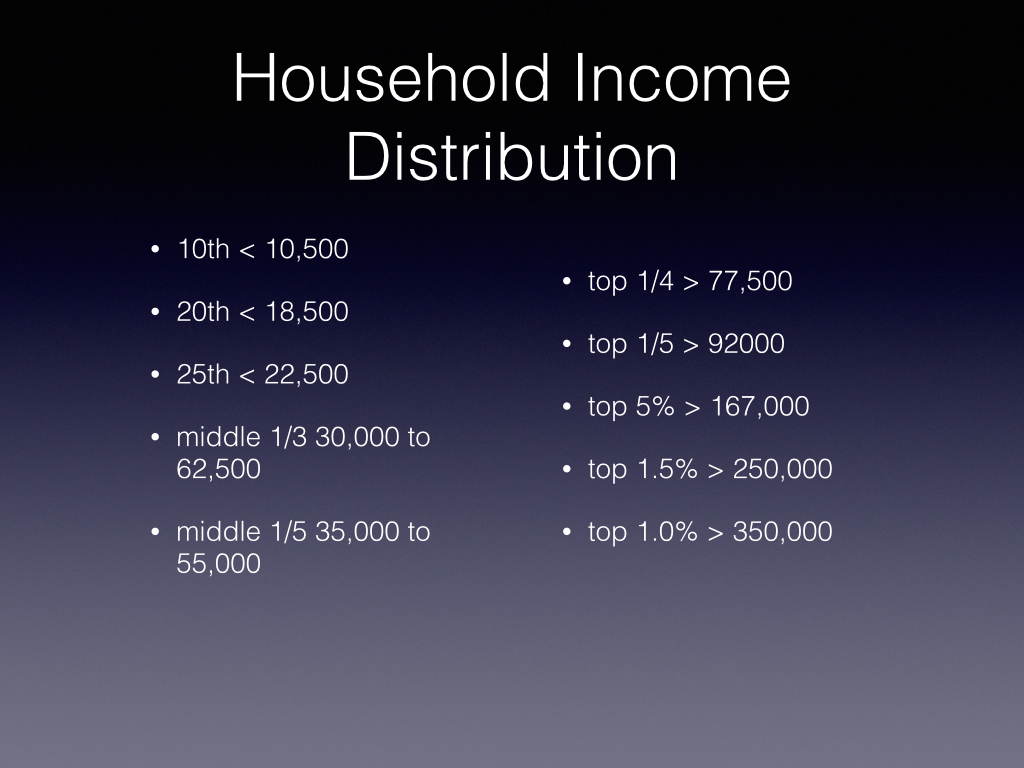 The figure shows some of the more important income bands. A percentile boundary represents the fraction of the population making less than that income level. For example, the tenth percentile tells us that 10 percent of the population earns less than $10,500. One quarter of us earn less than $22,500. One third of us earn between $30,000 and $62,500. Similarly, one quarter of us earn more than $77,000 and one fifth of us earn more than $92,000. Our doctors and dentists earn more than do 98 percent of us. The top 1.5% of income earners make more than $167,000 and to leave the 99% requires an income greater than $350,000.