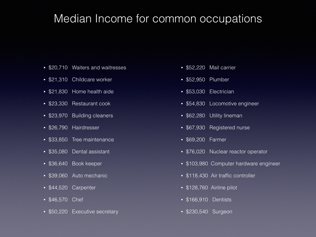 The table above shows median income for commonly encountered occupations. Median income is that income level dividing the occupation into two equal sized groups. Half make less than median and half make more. In choosing occupations from the reference, I was careful to choose occupations we commonly interact with. So barbers, auto mechanics, plumbers, waiters, cooks, janitors, dentists, surgeons, etc are all present as are some glamorous occupations like airline pilot.